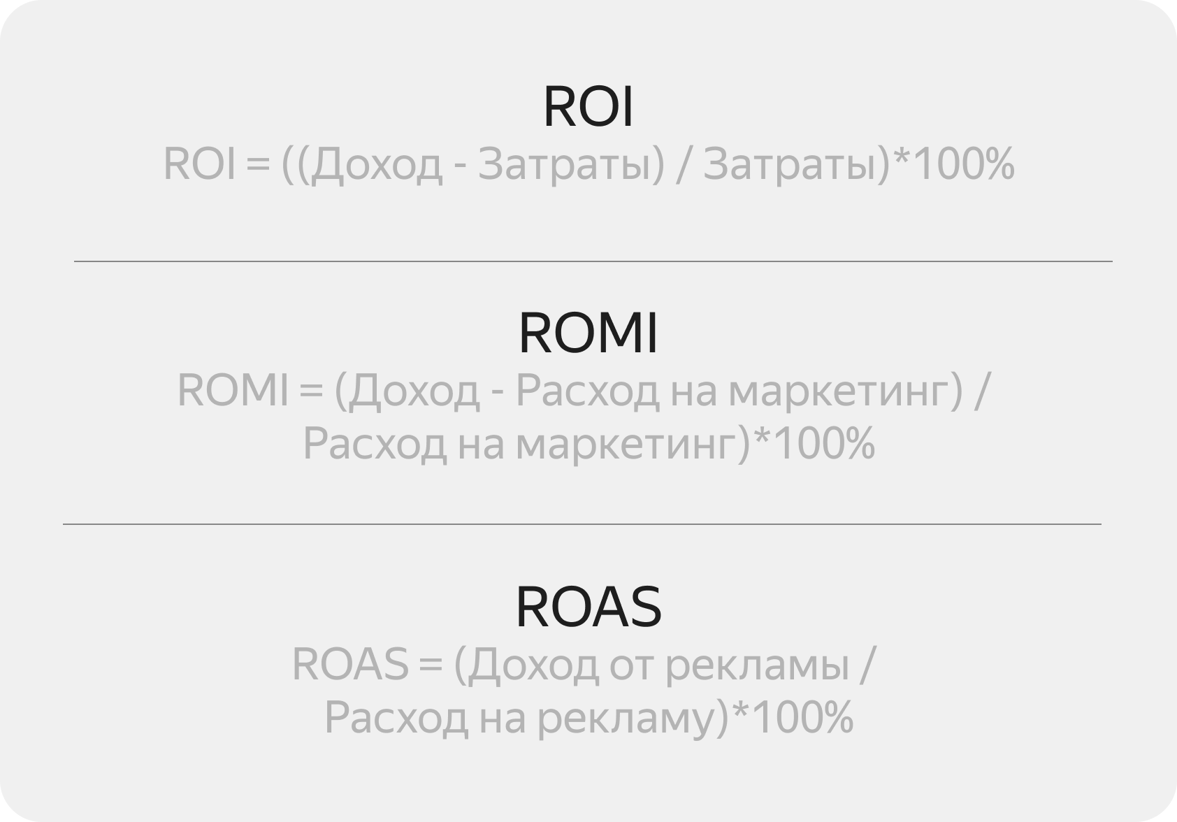Формулы, по которым считаются коэффициенты ROI, ROMI и ROAS