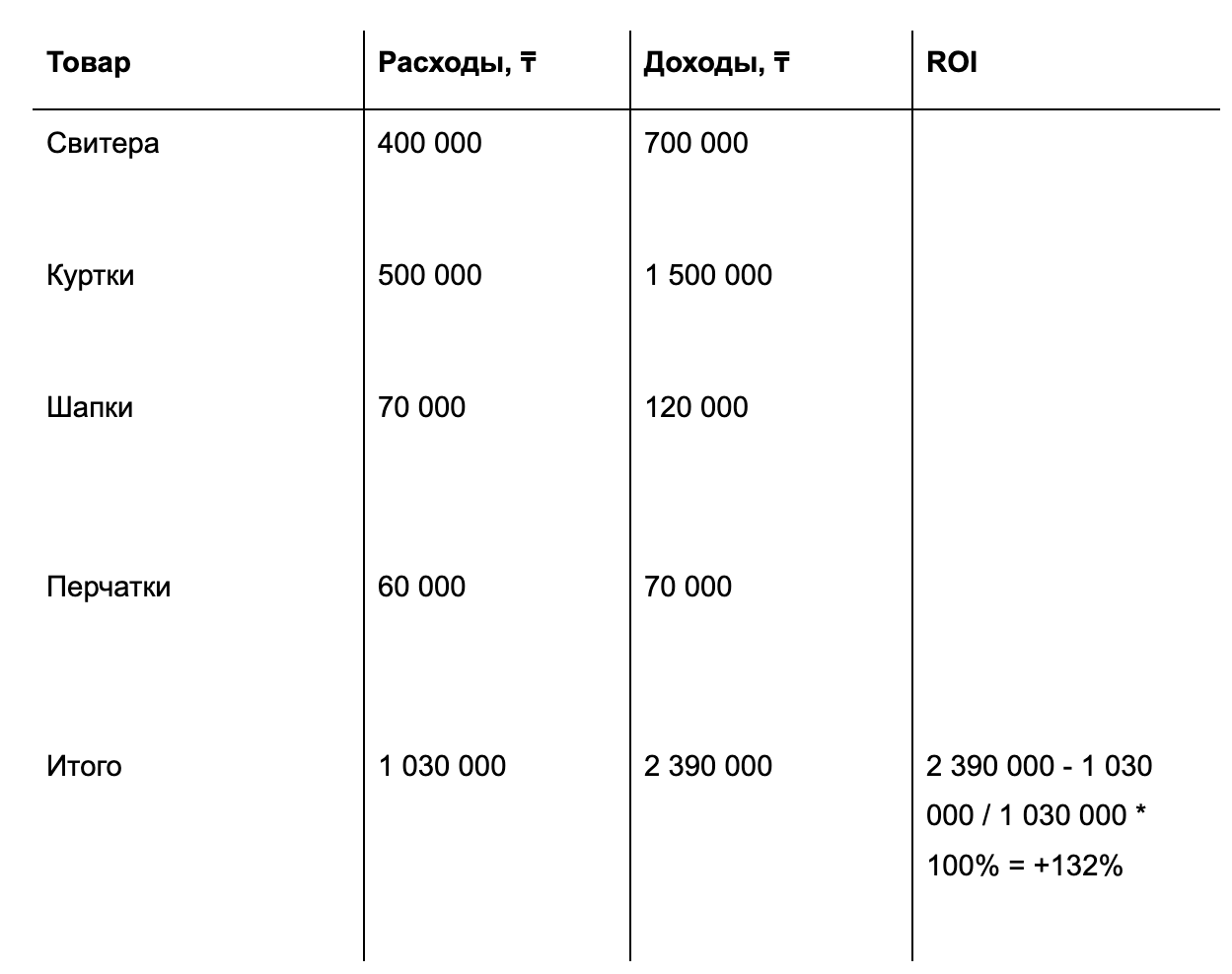 Теперь разберёмся, как считается метрика ROI. Представим, что интернет-маркетолог магазина одежды провёл рекламную кампанию, чтобы увеличить продажи товаров для зимнего сезона. По итогам он посчитал все расходы и доходы и получил следующие суммы: