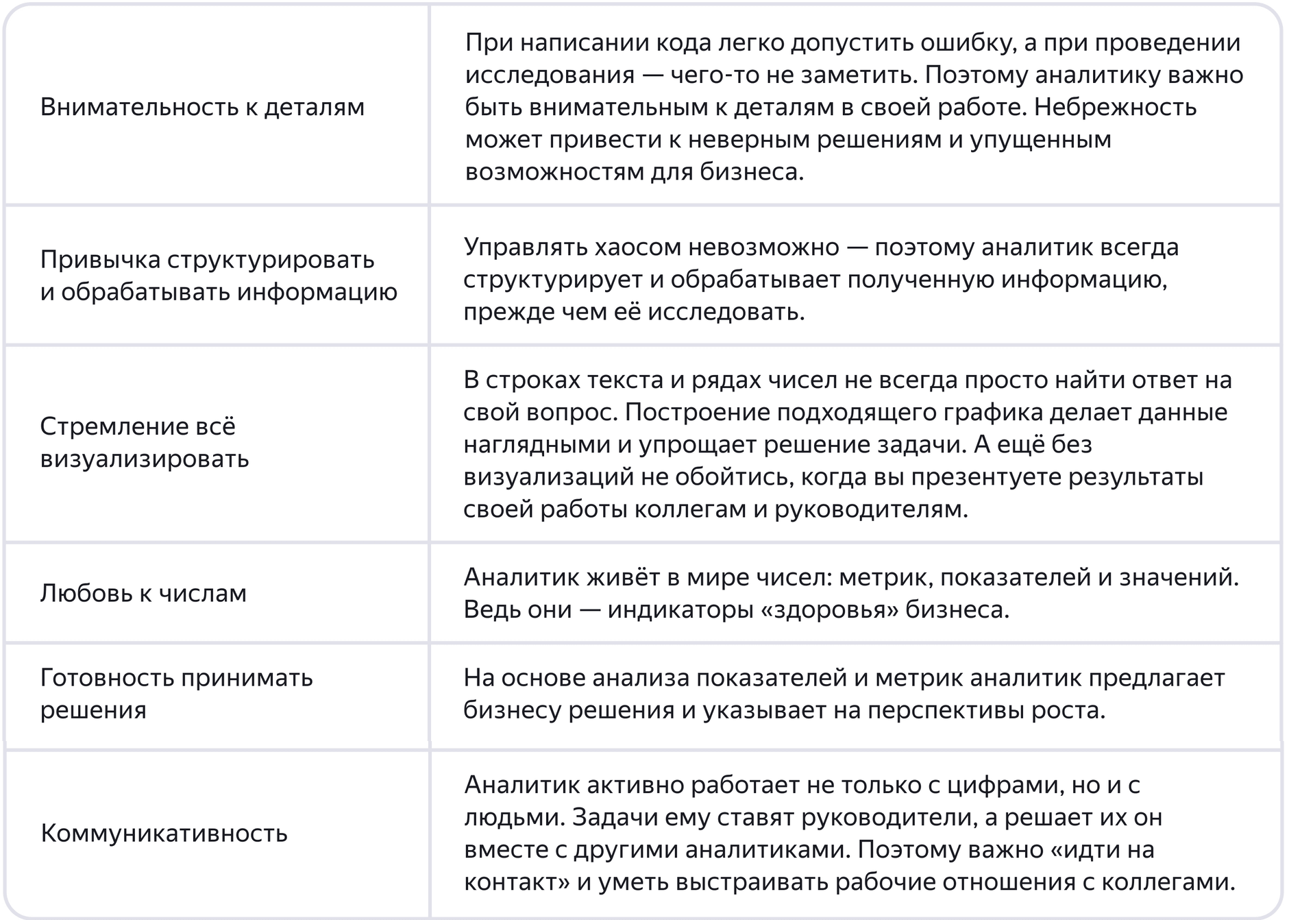 Глубокое понимание специфики бизнеса также имеет большое значение: грамотный Data Analyst досконально разбирается в особенностях сферы деятельности компании и хорошо знаком со всеми её продуктами или услугами. По сути, это гарантия того, что решения, которые он предлагает, будут способствовать росту прибыли компании.
