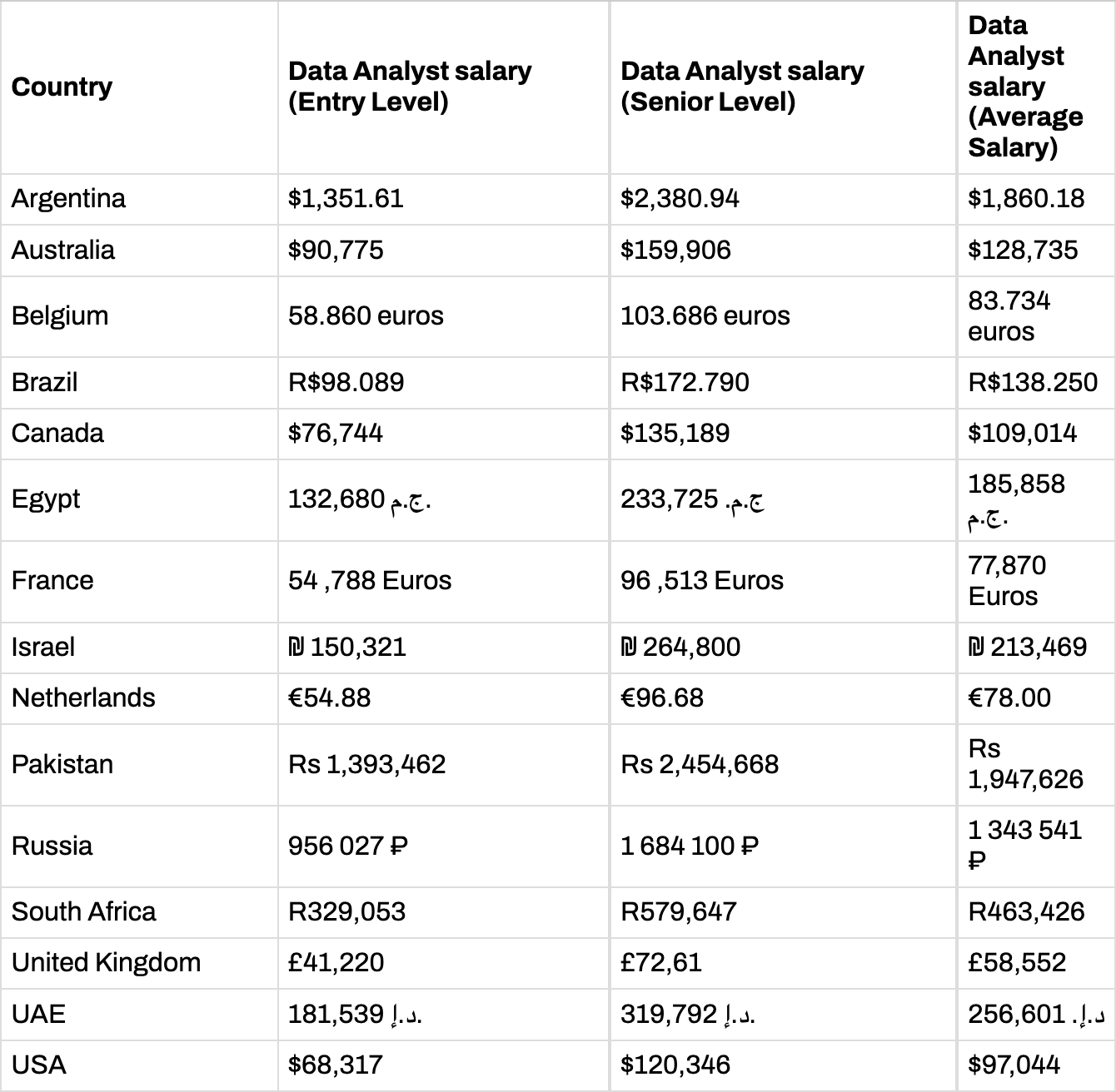 Примеры зарплаты аналитиков данных уровня джун и сеньор в разных странах. Источник: Edoxi